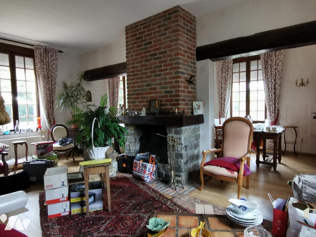 * d'une part salon-séjour (42,9 m², cheminée non tubée, escalier menant à l'étage) ;